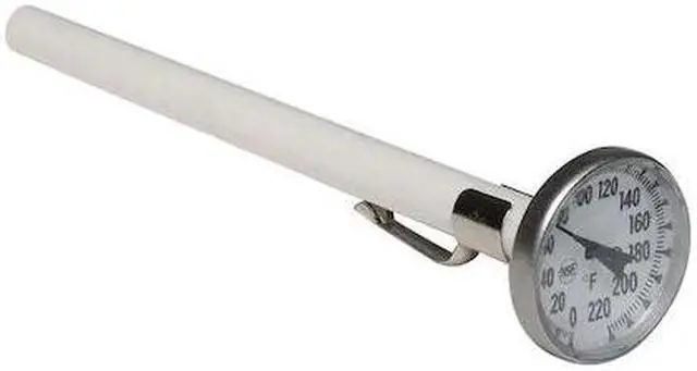 Dial Pocket Thermometer, Temp. Range (F) 0 to 220 Degrees F, Stem Length 5 in, Accuracy +/-2 Degrees F, Standards NSF Certified, Degree Divisions 2 Degrees, Resolution +/-2 Degrees F, Dial Size 1 in, Lens Material Polycarbonate, Stem Material Stainless Steel, Case Material Stainless Steel, Features Magnifying Domed Lens, Large Easy to Read Pointer, Includes Pocket Sheath, Manufacturers Warranty Length 1 yr. This item has been restricted from sale in the following state (s): []