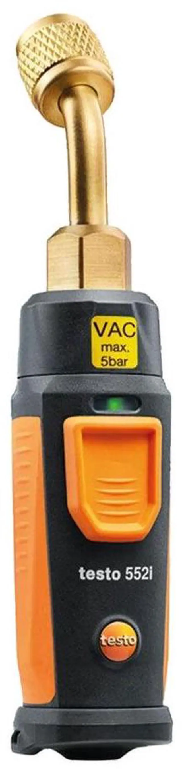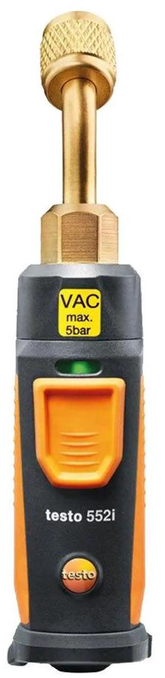 App-controlled testo 552i wireless vacuum probe, including batteries and calibration protocol.