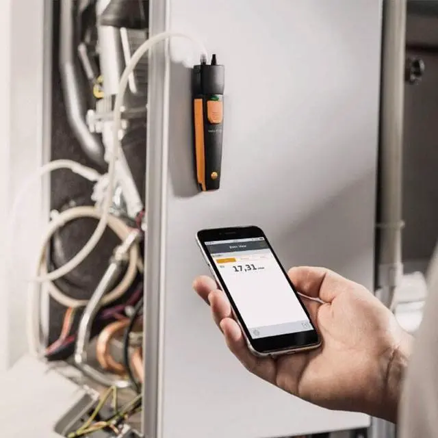 The testo 510i Smart Probe is a wireless differential pressure probe used for accurate low-pressure measurements. The testo 510i is great for measuring pressure in manifolds, static pressure, and pressure drops in buildings or ventilation systems. Use it to measure the pressure drop across coils and filters, or in ducts and systems.