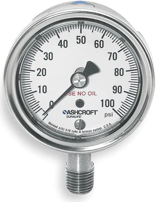 Industrial Pressure Gauge, Nominal Dial Size 2 1/2 in, Accuracy +/- 1.00 Percent, Gauge Case Material 304 Stainless Steel, Process Connection Type NPT, Process Connection Gender Male, Lens Material Polycarbonate, Process Connection Size 1/4 in, Field Fillable No, Process Connection Location Bottom, Case Color Metallic, IP/NEMA Rating IP54 (Plug Vented), IP65 (Plug Closed), NEMA 4 (Plug Closed), Primary Pressure Range 0 to 100, Dial Color White, Pressure Gauge Type Industrial Pressure Gauge. This item has been restricted from sale in the following state (s): []