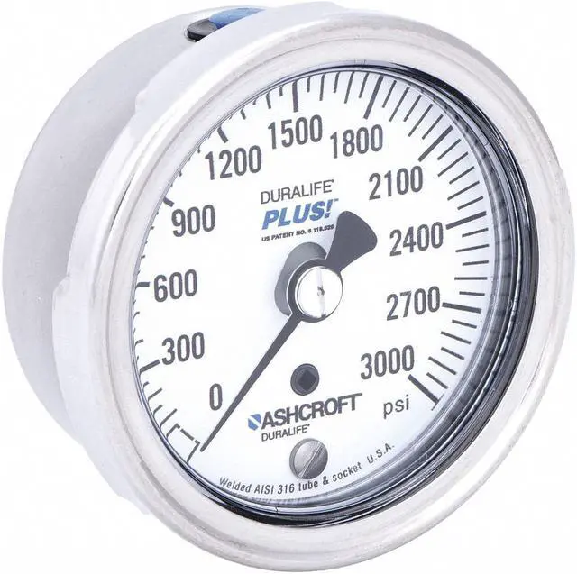 Industrial Pressure Gauge, Nominal Dial Size 2 1/2 in, Accuracy +/- 1.0 Percent, Gauge Case Material 304 Stainless Steel, Process Connection Type NPT, Process Connection Gender Male, Lens Material Polycarbonate, Process Connection Size 1/4 in, Field Fillable No, Process Connection Location Lower Back, Case Color Metallic, IP/NEMA Rating IP54 (Plug Vented), IP65 (Plug Closed), NEMA 4 (Plug Closed), Primary Pressure Range 0 to 3, 000, Dry Dampening Feature PLUS! Performance. This item has been restricted from sale in the following state (s): []