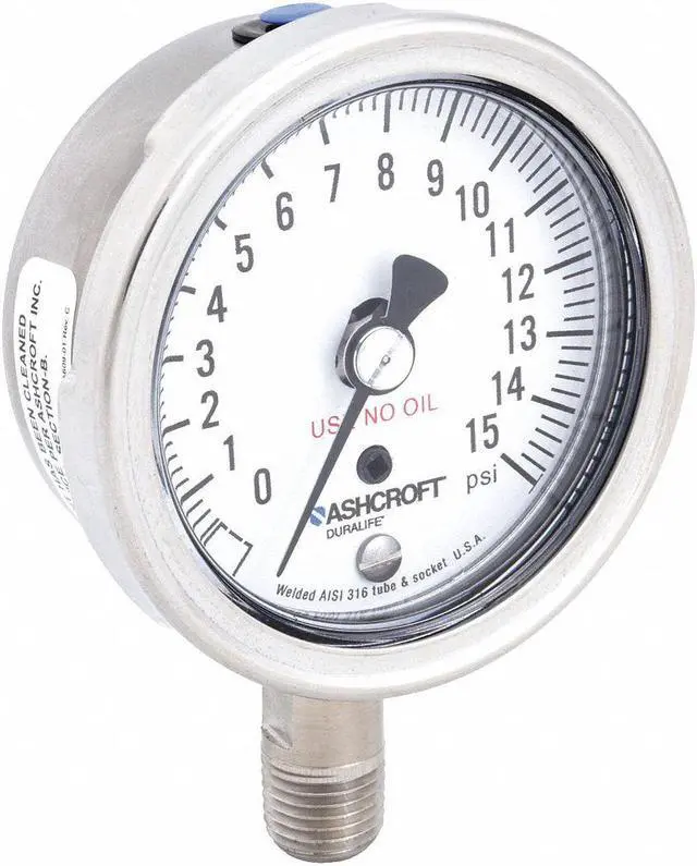 Industrial Pressure Gauge, Nominal Dial Size 2 1/2 in, Accuracy +/- 1.00 Percent, Gauge Case Material 304 Stainless Steel, Process Connection Type NPT, Process Connection Gender Male, Lens Material Polycarbonate, Process Connection Size 1/4 in, Field Fillable No, Process Connection Location Bottom, Case Color Metallic, IP/NEMA Rating IP54 (Plug Vented), IP65 (Plug Closed), NEMA 4 (Plug Closed), Primary Pressure Range 0 to 15, Dial Color White, Pressure Gauge Type Industrial Pressure Gauge. This item has been restricted from sale in the following state (s): []