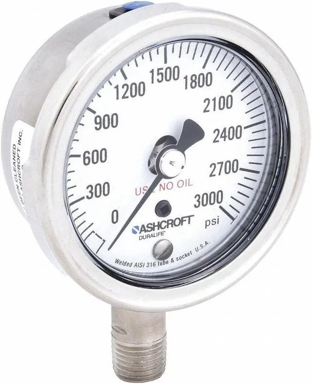 Industrial Pressure Gauge, Nominal Dial Size 2 1/2 in, Accuracy +/- 1.00 Percent, Gauge Case Material 304 Stainless Steel, Process Connection Type NPT, Process Connection Gender Male, Lens Material Polycarbonate, Process Connection Size 1/4 in, Field Fillable No, Process Connection Location Bottom, Case Color Metallic, IP/NEMA Rating IP54 (Plug Vented), IP65 (Plug Closed), NEMA 4 (Plug Closed), Primary Pressure Range 0 to 3, 000, Dial Color White, Pressure Gauge Type Industrial Pressure Gauge. This item has been restricted from sale in the following state (s): []