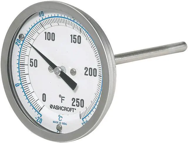 Dial Thermometer, Temperature Range 0 Degrees to 250 Degrees F/-20 Degrees to 120 Degrees C, Stem Length 6 in, Dial Diameter 5 in, 1/2 in NPT, Back, Includes NIST-Traceable Certificate No, Housing Material 304 Stainless Steel, Lens Material Glass. This item has been restricted from sale in the following state (s): []