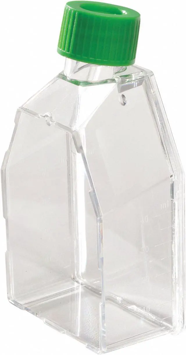 Cell Culture Flask, Capacity - Metric 25 mL, Capacity - English 0.84 fl oz, Flask Type Cell Culture, Overall Height - Metric 24.5 mm, USP Specification Type IV, Tolerance +/-2.00 Percent, Includes Closure Yes, Closure Type Vented Cap, Neck Style Canted, Closure Material HDPE, Compatible with Stopper Size Not Applicable, Body Material Polystyrene, Sterile/Non-Sterile Sterile, Autoclavable No, Body Color Clear, Graduated Yes, Graduation Increments - Metric 5 mL, Mouth Size Narrow