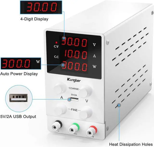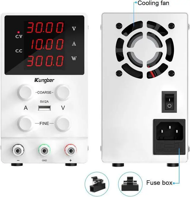 Safety: many safety measures are adopt in Kungber lab DC power supply - Grounding wire, Leakage protection, Thermal protection, Voltage overload protection, Power overload protection and Short-circuit protection. Kungber power supply use premium electronic components, provide reliable working status and prolong the life of product effectively. When the working temperature is more than 122/50, the intelligent thermal protection will active the cooling fan to lower the temperature.