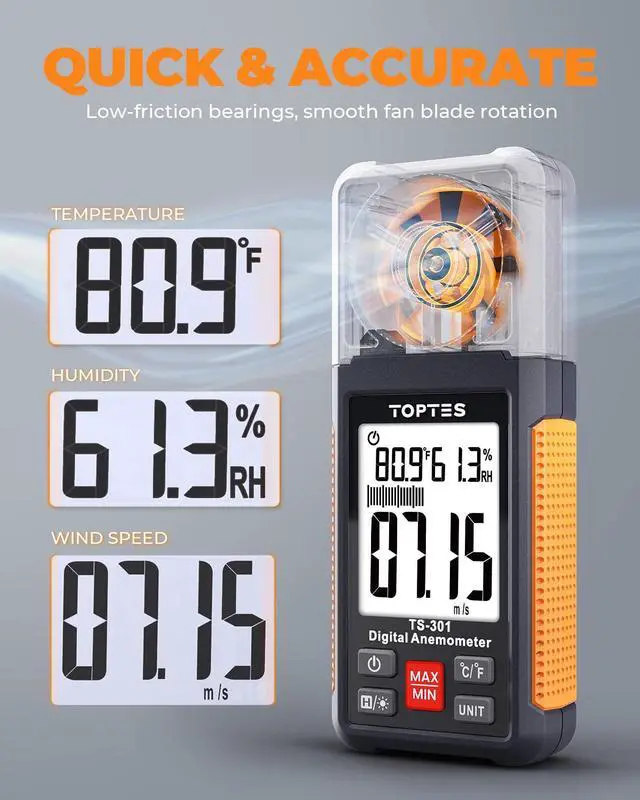 The TS-301 wind speed meter is equipped with a temperature and humidity sensor that allows for measuring wind humidity and temperature readings. The relative humidity measuring range is 0.0 %~ 99.9 %RH. The temperature measuring range is - 4.0F to 140.0F. Please note that it may take at least 30 minutes for the temperature and humidity sensors to adjust to the new environment