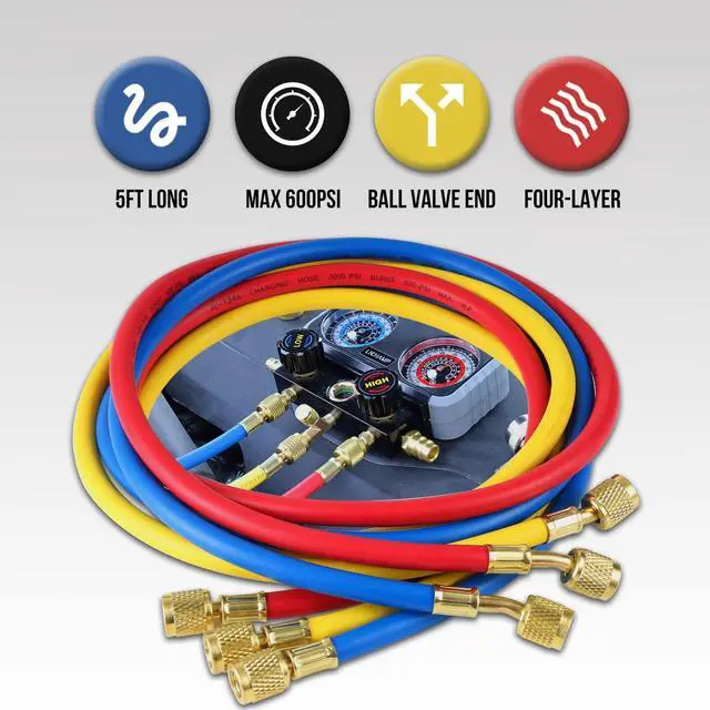 • HIGH QUALITY HOSE: Include 4 pieces extra long 5 FT and high impact hose, thickening hose body with precise valve core depressor and 45 degree bend on one end for convenient access. Hose rated 600 psi max max working pressure and 3000 psi burst pressure