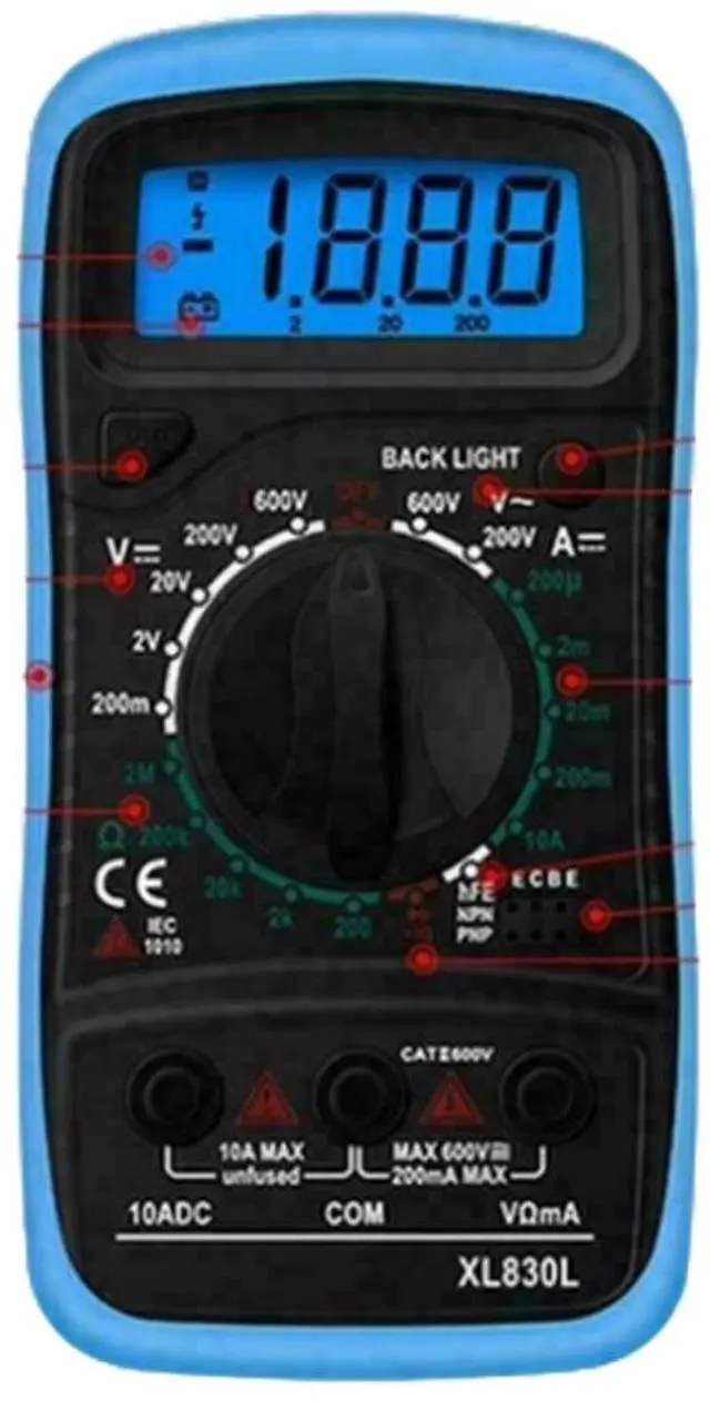 This digital multimeter is a versatile tool for electronics testing and electrical work. It has a wide range of functions, including AC voltage, DC voltage, current, resistance, continuity, diode, and transistor testing. It also features a backlight, data hold button, and auditory buzzer for continuity testing.
