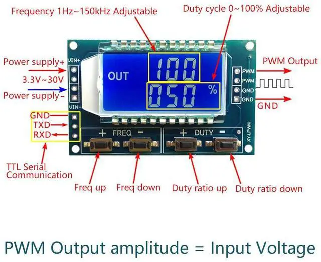 Working voltage: 3.3~30V; Frequency range: 1Hz~150KHz; Duty cycle value range: 0~100%.