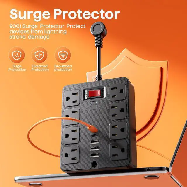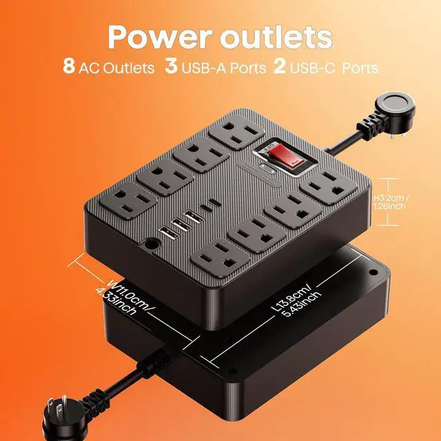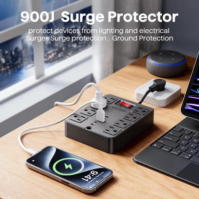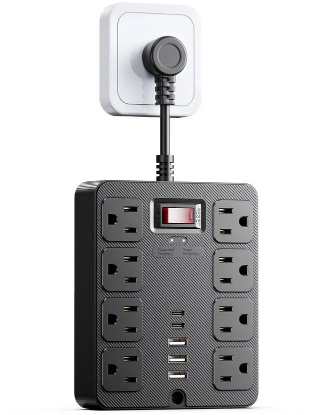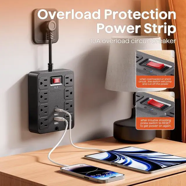 The US Power Strip delivers 12 charging points with customizable cable length. Choose from 1.5m to 7.5m (5FT to 25FT) power cords to reach anywhere in your room. With 8 AC outlets, 4 USB ports (2 USB-A + 2 USB-C), surge protection, and master switch, this power strip adapts to your space.