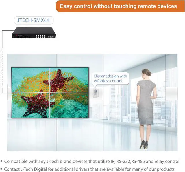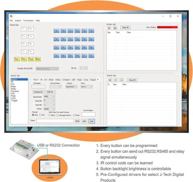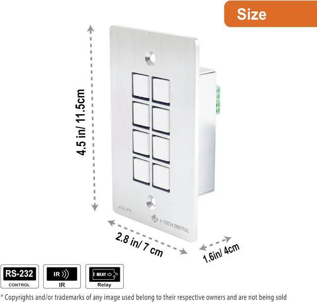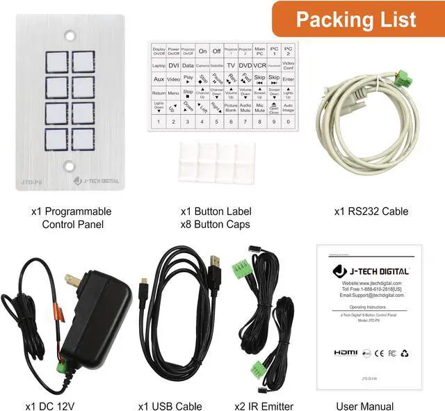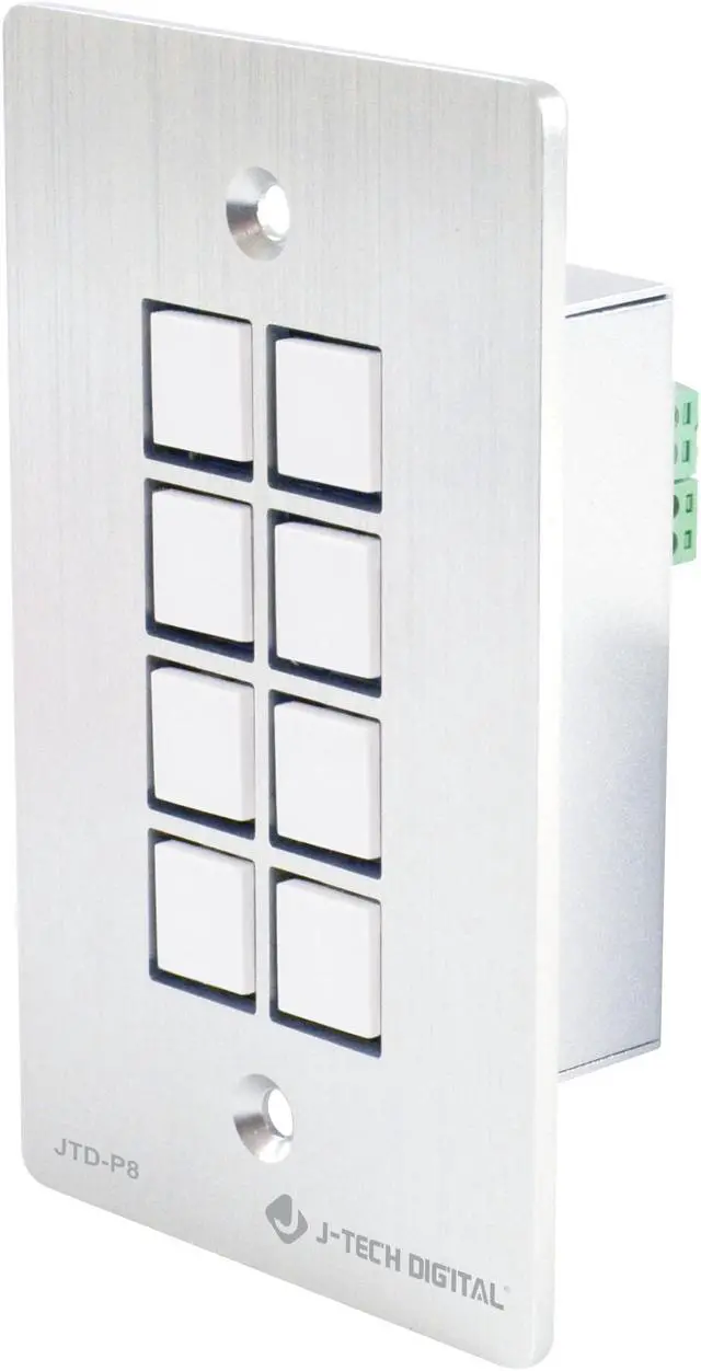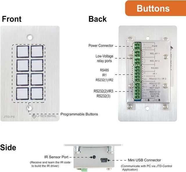 Description: The JTD-P8 is a programmable control panel that is designed to control your audio/video devices using infrared (IR), RS-232, RS-485, and relay communication. Every button on the wall plate is programmable and works either individually or together. This programmable control panel consists of 3x RS232, 1x RS485, 3x IR, 2x relays, and 1x mini USB interface for easy, one-touch programming. The RS-232 (1) and IR (2) share the same port and cannot be used at the same time. Also, RS232 (2) and IR (3) share the same port and cannot be used at the same time. With this unit you can fully control our products as well as third-party devices such as projectors, screens, TVs, etc. To download pre-configured drivers and RS-232 commands for the device you wish to control, visit J-Tech Digital's website or contact J-Tech Digital's support team.