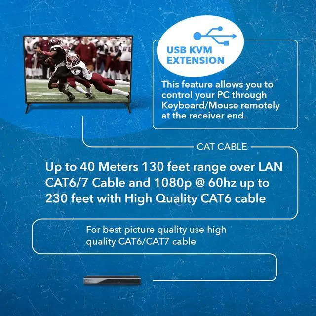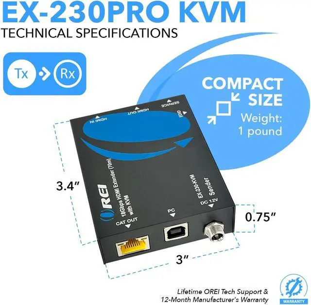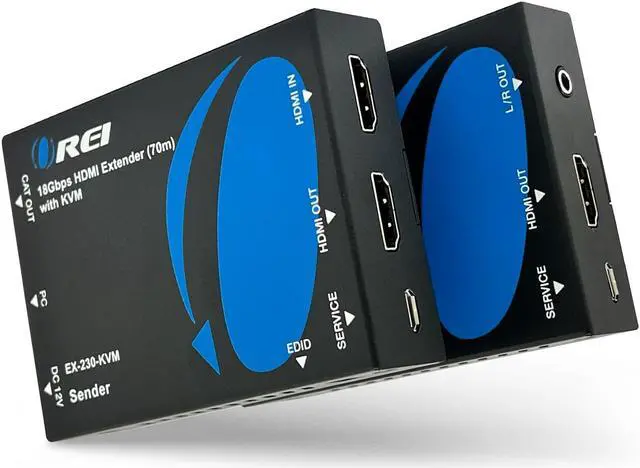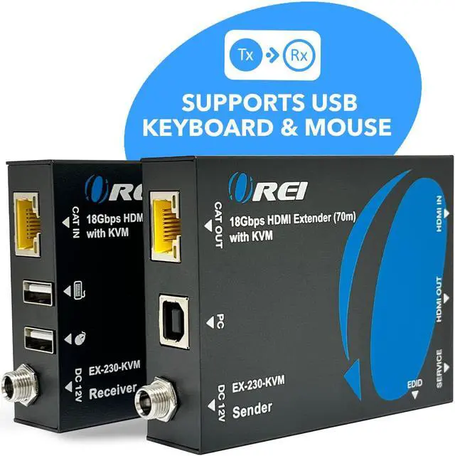 The OREI EX-230PRO-KVM KVM HDMI extender balun allows you to transmit HDMI audio/video signals over Cat/6/7 cable with zero latency along with maintaining original audio/video quality. It supports up to 4K@30Hz and extends the transmission distance up to 130 feet using high-quality cat6/70 cables. Also lets you extend your USB such as Keyboard and Mouse over the same LAN Cable. OREI technology transmits uncompressed HDMI audio and video, Compact, durable and easy to set up and operate. Ideal for home, businesses, test bench facilities, data centers, and help desks.