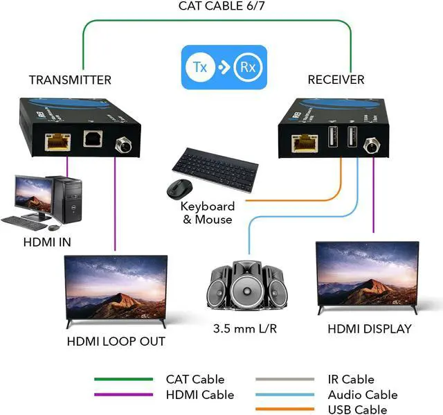 HDMI Loop-out - Connect HDMI display to the transmitter for an output to local display at the source. Analog Audo-out - 3.5 mm audio output on receiver for PCM output when the audio stream is along from the source