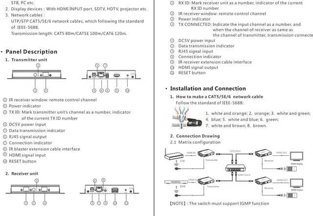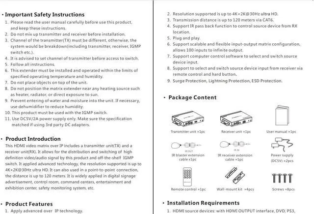 This HDMI video matrix over IP includes a transmitter unit (TX) and a receiver unit (RX). It allows for the distribution and switching of high definition video/audio signal by this product and off-the-shelf IGMP switch. It applied advanced technology, the resolution supported is up to 4K×2K@30Hz ultra HD. It can also used in a point-to-point connection, the distance is up to 120 meters. It is widely applied in digital signage advertisement, control room, command centers, entertainment and exhibition center, safety monitoring system, etc.
