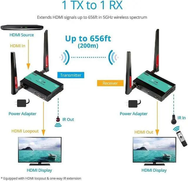 1 TX and 1 RX kit, 1080p@60Hz HDMI Wireless Extender with Loopout, HDCP 1.3 compliant 5GHz Wireless Splitter, Up to 656ft / 200M