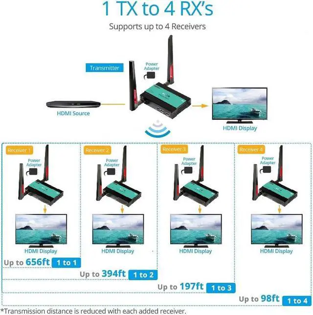 4-RECEIVER SUPPORT This kit comes with 1 Transmitter and 1 Receiver, but can support up to 4 Receivers, displaying the same content across all displays simultaneously.
