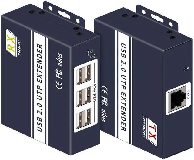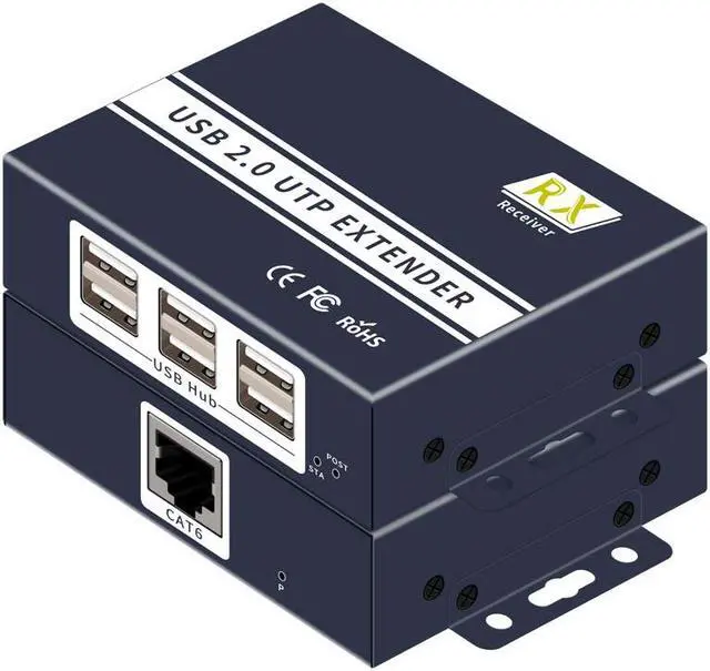 This is a USB 2.0 extender, which can realize one-to-one connection through CAT5e/6/7 network cables, with a transmission distance of up to 100m for CAT5e and 150m for CAT6 and above; When the connection passes through the switch, the input and output cable distances can reach 100m respectively. It supports 6 channels of USB 2.0 device input, such as printer, camera, scanner, USB flash drive, keyboard, mouse, touchscreen, etc., and supports gigabit switch cascade.
