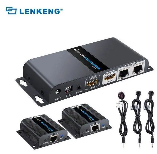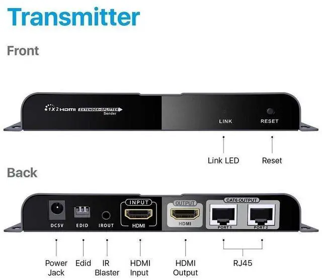 This HDMI extender splitter includs one transmitter and two receivers, extend 1 HDMI source to 2 HDMI displays over single CAT6/6a/7 cable up to 40m/131ft. The highest resolution supported is 1920×1080@60Hz, and it supports IR passback, EDID pass through and only one power adapter for the transmitter is needed, the Receiver is powered by the transmitter over CAT6 cable. Ideal solution for HDMI exhibition, Video conference and show center, ect.