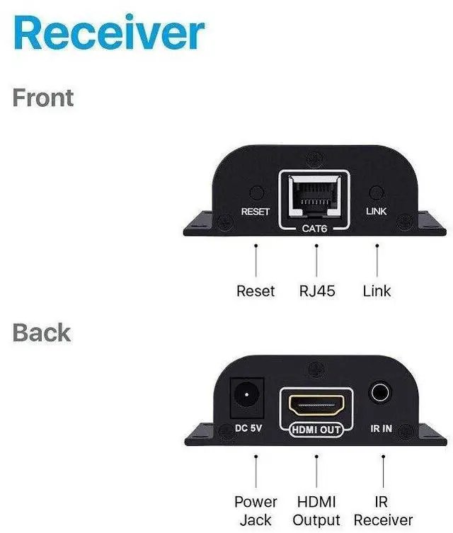 8. Support power from transmitter to receiver unit over the CAT6 cable.