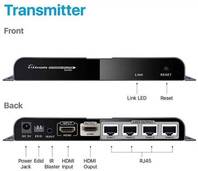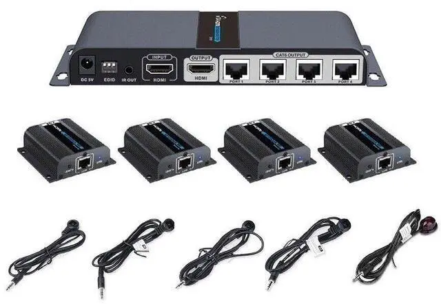 This HDMI extender splitter includs one transmitter and four receivers, extend 1 HDMI source to 4 HDMI displays over single CAT6/6a/7 cable up to 40m/131ft. The highest resolution supported is 1920×1080@60Hz, and it supports IR passback, EDID pass through and only one power adapter for the transmitter is needed, the Receiver is powered by the transmitter over CAT6 cable. Ideal solution for HDMI exhibition, Video conference and show center, ect.