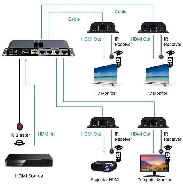 1. Distribute 1 HDMI source to 4 HDMI displays over network cable simultaneously.