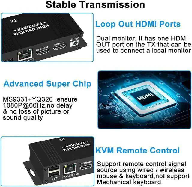 HDMI KVM Extender with POE & Loop Out 1080P HDMI USB Extender 60m No Loss RJ45 to HDMI Extender Transmitter Receiver over Cat5e/Cat6