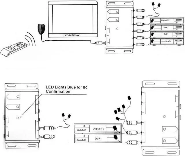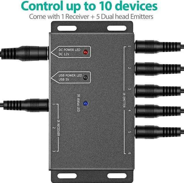 The IR Repeater can control up to 10 home theater devices that are kept behind closet doors or in closed cabinets with an IR IR Remote Extender Repeater System. This product allows you to use your existing infrared remote control to control A/V equipment such as: amplifiers, cable boxes, stereo receivers, satellite TV receivers, CD players, DVD players, Blu-ray players, etc.