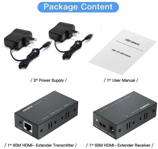 • HDMI Extender: This HDMI Transmitter and Receiver extends HDMI digital video & audio signals simultaneously over single CAT5e/6 ethernet lan cable, the maximum transmission distance up to at least 196ft(60 meters). No drivers needed. Just plug and play.