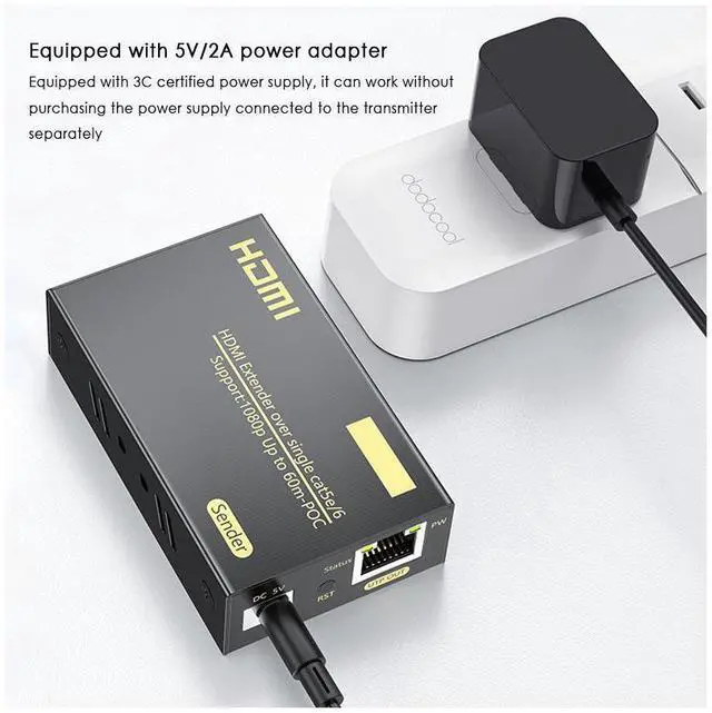 This HDMI Extender by single CAT 5e&6 cable. Instead of using expensive HDMI cables, 1080P HD resolution video via CAT5e,6 specifications extend 60 meters or more away HDMI display. It not only breaks the HDMI cable transmission distances nature and environment, so that other projects and home wiring more stable and efficient