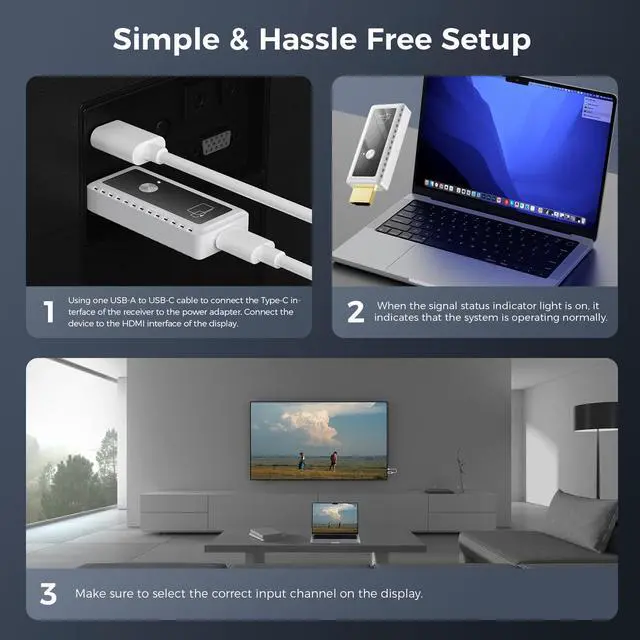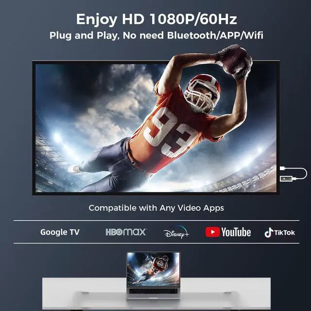 Plug and PlayThe wireless display adapter offer true plug-and-play functionality, with no apps required for easy and efficient setup. Simply connect the wireless HDMI adapter to your TV and power it, find mirror function on your device to cast. The included USB cable requires a power supply, many modern TVs and projectors have a USB port near the HDMI input and the battery pack can be used if the port is occupied.