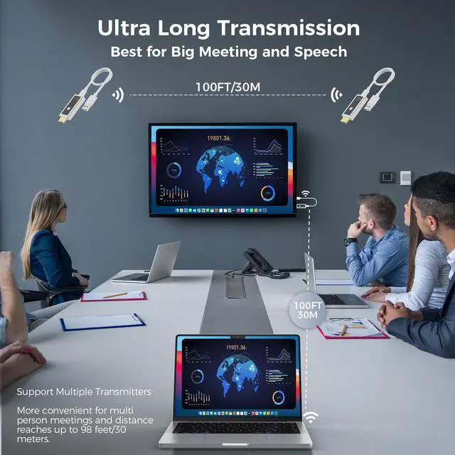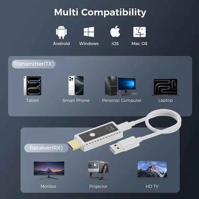 Screen SharingThis HDMI Wireless Extender supports Airplay images of iOS/MAC systems, and Miracast standard protocols of Android/Windows systems. The wireless display adapter supports with iPhone, Android, laptops, tablets. The screen can be freely switched between horizontal and vertical modes. Experience smooth, vibrant visuals whether youre watching movies, gaming, or delivering a business presentation.