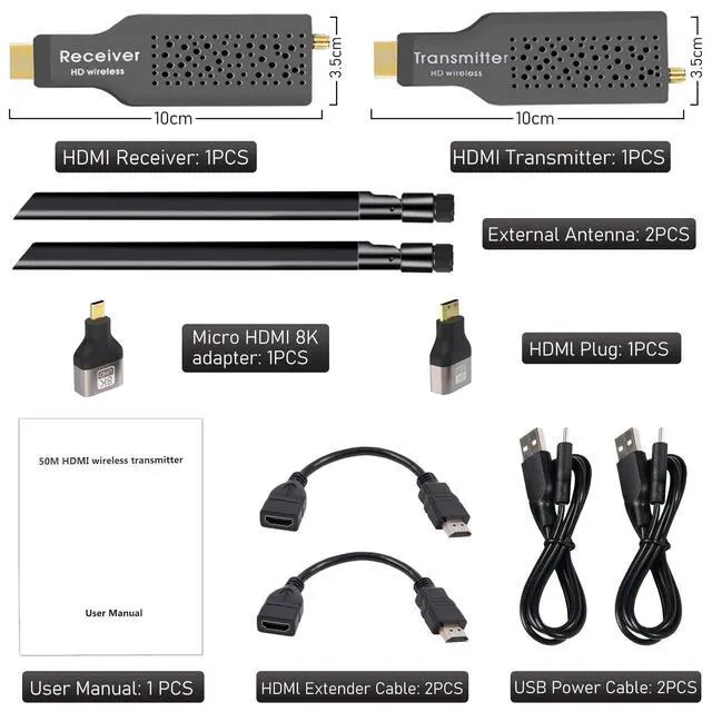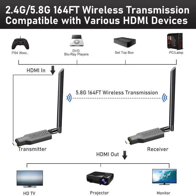 Long Distance Transmission: Wireless HDMI transmission adopts 2.4G/5.8G transmission protocol, strong anti-interference, high signal stability, the transmission distance can reach up to 164ft/50M, even through the wall or obstacles, it can maintain a reliable connection. (Note: The transmission distance and speed may be affected when the product passes through walls or encounters obstacles).