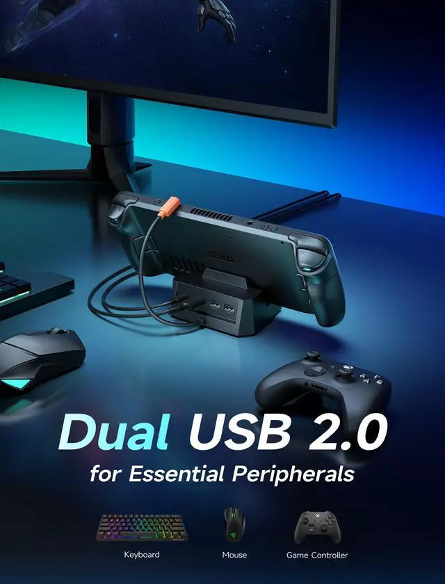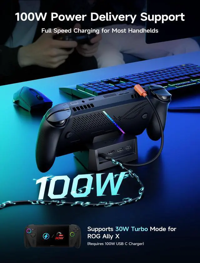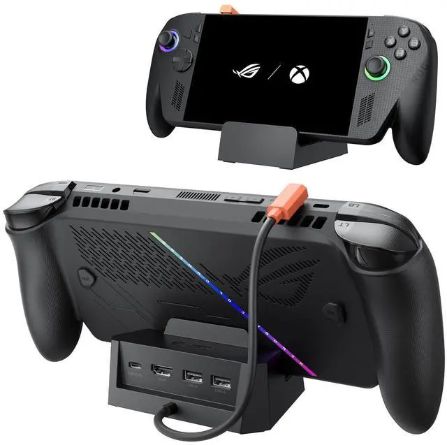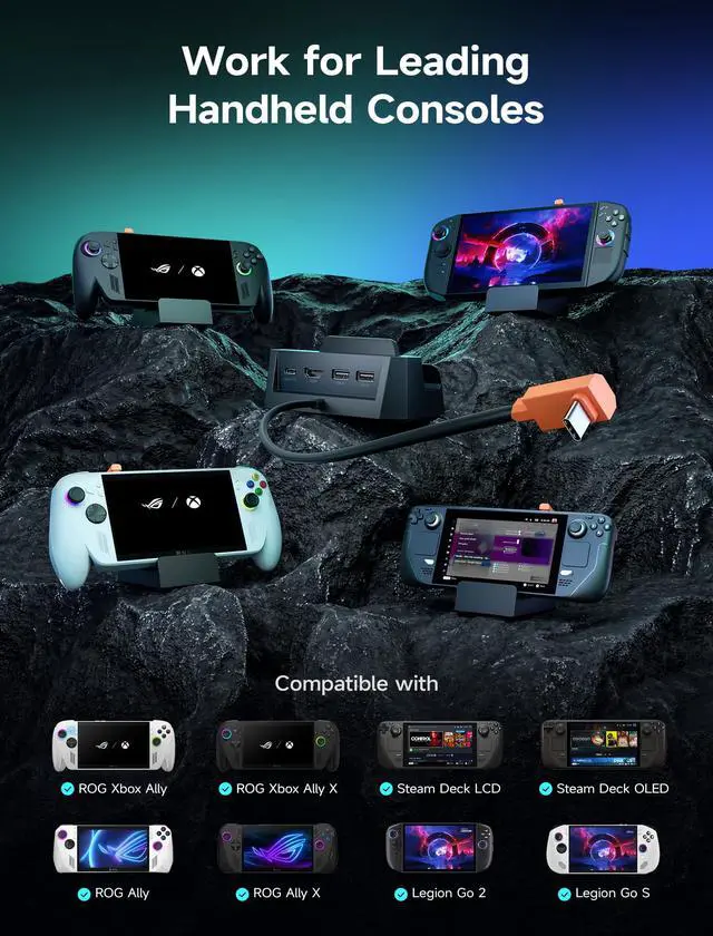 UNIVERSAL HANDHELD SUPPORT: Designed with a widened and raised base to accommodate devices with protruding grips, this dock supports ROG Xbox Ally/Xbox Ally X, Steam Deck LCD/OLED, ROG Ally/Ally X, Legion Go/Go 2/Go S, MSI Claw, and OneXplayer and so on. One dock for todays leading Windows and SteamOS handheld gaming PCs. NOTE: Not compatible with Nintendo Switch 2.