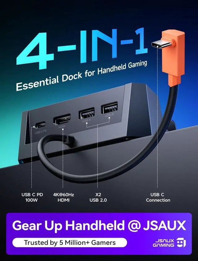 4-in-1 USB C Dock for Handheld Gaming, HDMI 2.0 4K@60Hz Output, 100W Power Delivery, 2 USB 2.0, Compatible with ROG Xbox Ally/Xbox Ally X/Steam Deck LCD & OLED/ROG Ally X/Legion Go 2/S-HB0503