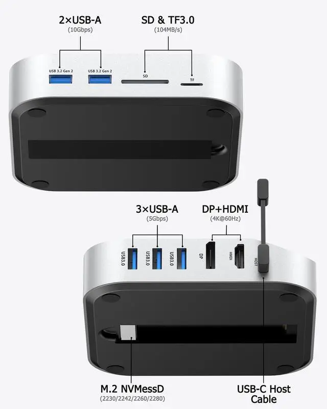 Mac mini M4 Dock with NVMe SSD Enclosure, Docking Station Dual Monitor for Mac mini M4/M4 Pro, 6-Port USB-C Hub with 4K60Hz HDMI, DisplayPort, SD/TF Card Reader, 10Gbps USB-A