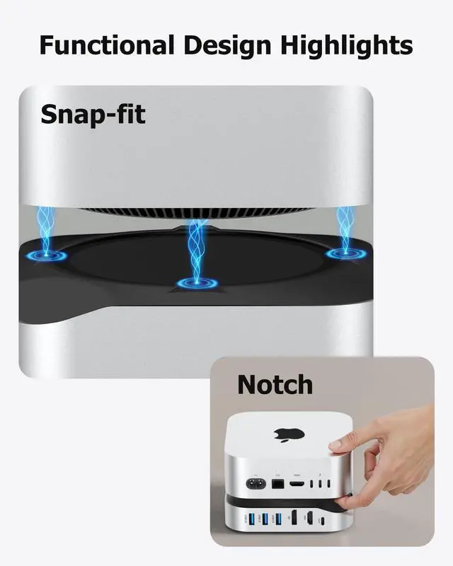 [Tool-Free SSD Installation with Magnetic Cover] The BAOZEE Mac Mini Dock features a magnetic bottom cover for easy SSD installationno screws required. Insert your NVMe SSD and benefit from efficient heat dissipation with the included thermal pad, ensuring stable performance during intensive tasks.