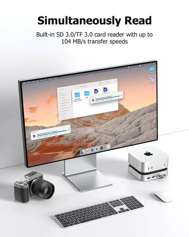 [MST Mode and Mirror Mode for Dual Displays] Easily set up dual displays with Extended Mode by connecting the Mac Mini HDMI port to the first display and using the docks HDMI/DP port for the second display, creating a larger workspace with 4K at 60Hz on both screens. Alternatively, enable Mirror Mode by connecting both displays to the docks HDMI and DP ports, displaying identical content on each screen at 4K at 60Hz.