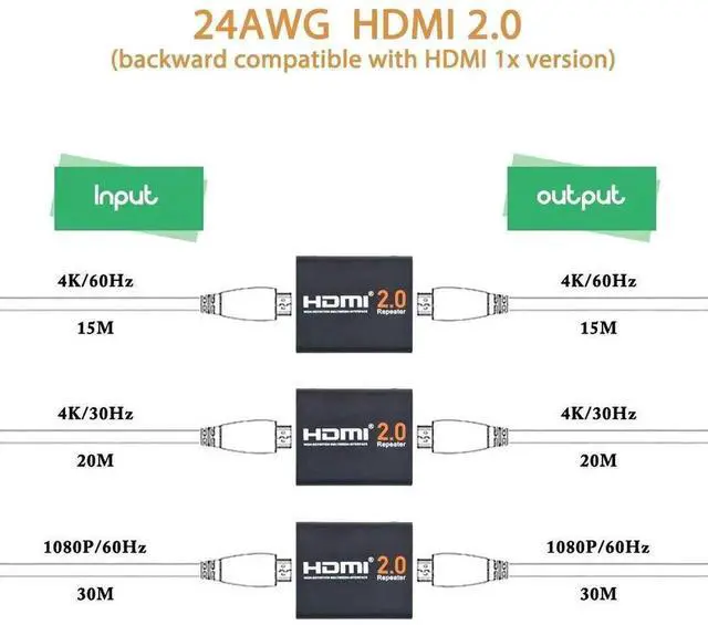 HDMI 2.0 24AWG cable input resolution 1080P/60Hz, both input and output transmission distance are up to 100ft (200ft in total)