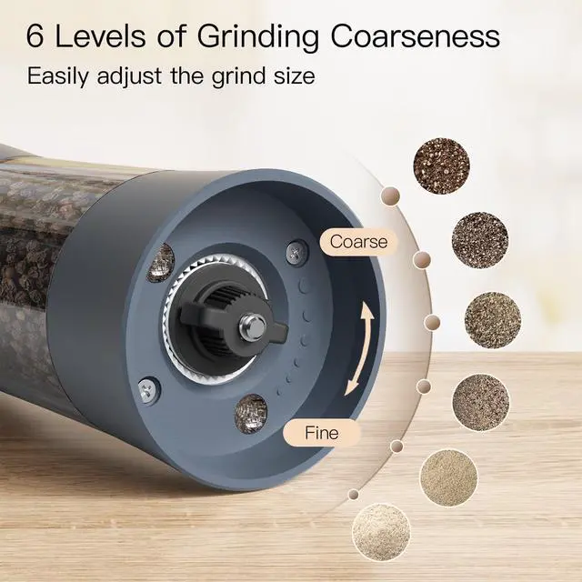| 6 Adjustable Coarseness | 6 Adjustable Coarseness | 6 Adjustable Coarseness | Low Energy Consumption | Auto Shut Off, Tare Function | 6 Browning Settings |
