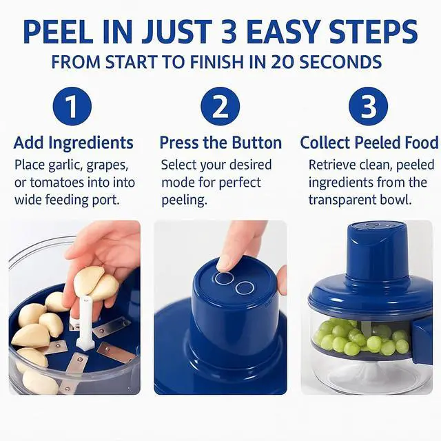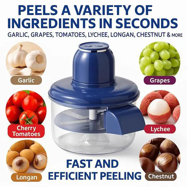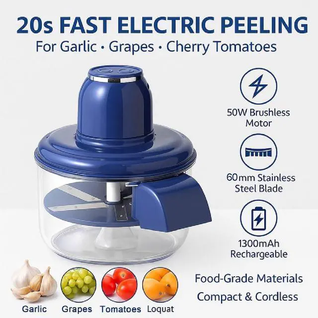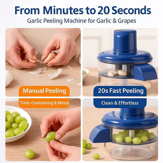 The garlic peeling machine delivers 20-second fast peeling for garlic, grapes, and cherry tomatoes. Powered by a 50W motor and a 200mm stainless steel blade, this automatic garlic peeler makes food prep faster and easier for home cooks and professionals.