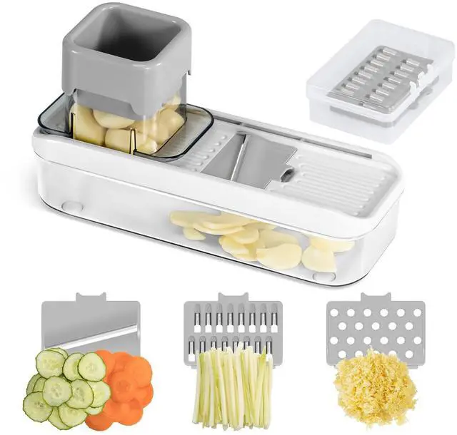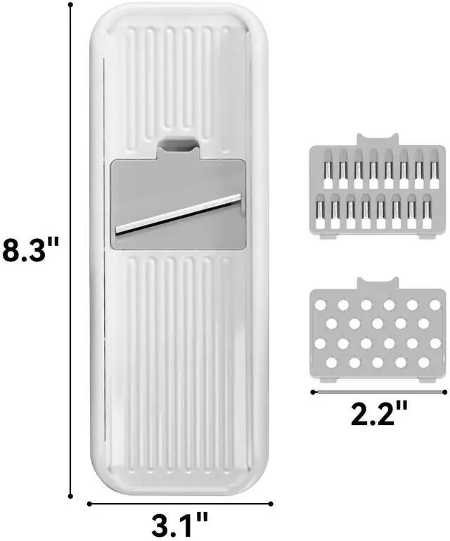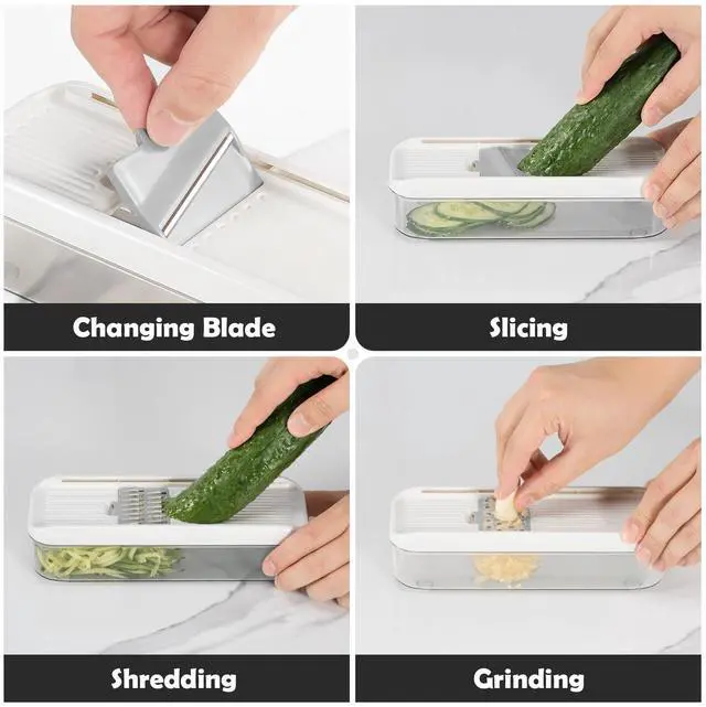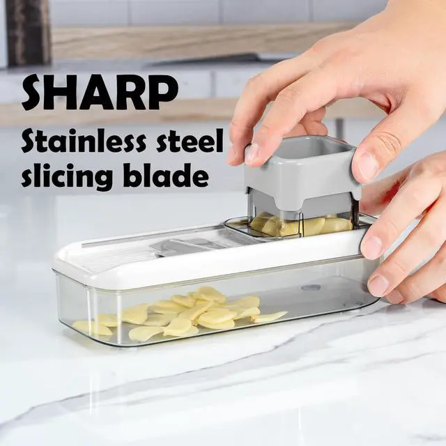 This mini vegetable slicer is equipped with 3 sharp stainless steel blades including a slicing blade, a shredding blade and a grinding blade.