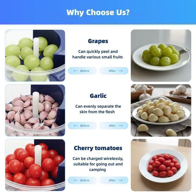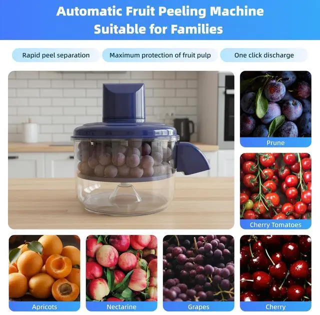 Say goodbye to tedious manual peeling! This automatic peeler can efficiently peel soft skinned fruits such as grapes and tomatoes with just one press. The powerful electric drive system makes kitchen preparation quick and effortless, making it an indispensable automatic kitchen tool