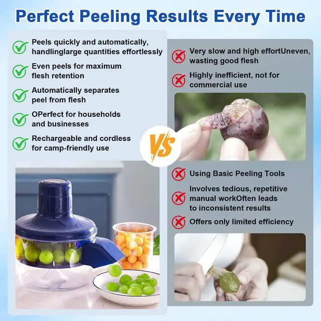 Effortless Automatic Peeling in 20 Seconds Say goodbye to tedious manual peeling! Our grape peeling machine automatically peels grapes, garlic, cherry tomatoes, and other small fruits in just 20 seconds, saving you time and effort. With a powerful 50W motor and five-blade adapter, it boosts efficiency tenfold, making it ideal for busy home kitchens or commercial use. No more uneven peeling or wasted fruitenjoy perfectly peeled results every time.