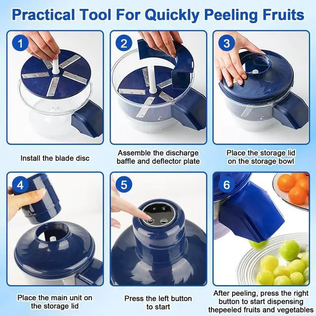 Safe & Easy One-Button Operation Designed for everyone, our electric peeler features simple one-touch operationjust load, press, and let it work! Made from baby-safe, non-toxic materials, it ensures gentle handling with no exposed sharp blades. The compact size (7.8"x7.8"x8.6") fits easily in any kitchen, while the one-touch reverse function conveniently unloads peeled fruits through the outlet.