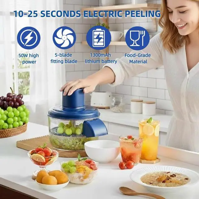 This automatic electric peeler simplifies kitchen prep by taking the work out of peeling small fruits. Designed as an efficient grape peeling machine, it gently handles smooth-skinned produce like grapes, cherry tomatoes, and plums using a quick, rolling motion. The unit features a clear, detachable bowl and a cordless, rechargeable design for excellent portability, functioning as a versatile fruit peeler and vegetable peeler for delicate items. It is a great tool for home cooks, busy parents, or anyone who values convenience in meal preparation. Whether you are making salads, snacks, sauces, or homemade jams, this electric peeler machine saves time and effort. Its straightforward operation makes it a suitable automatic peeler tool for everyday use, helping you prep ingredients faster for various recipes and family occasions. The one-button start and reliable base ensure simple operation. Cleanup is equally easy since the main parts detach for a quick rinse. This electric peeler offers a consistent way to peel fruits while keeping them intact, helping to minimize waste. The cordless design and simple maintenance make it a practical, long-lasting addition to any kitchen, streamlining your cooking process from start to finish.