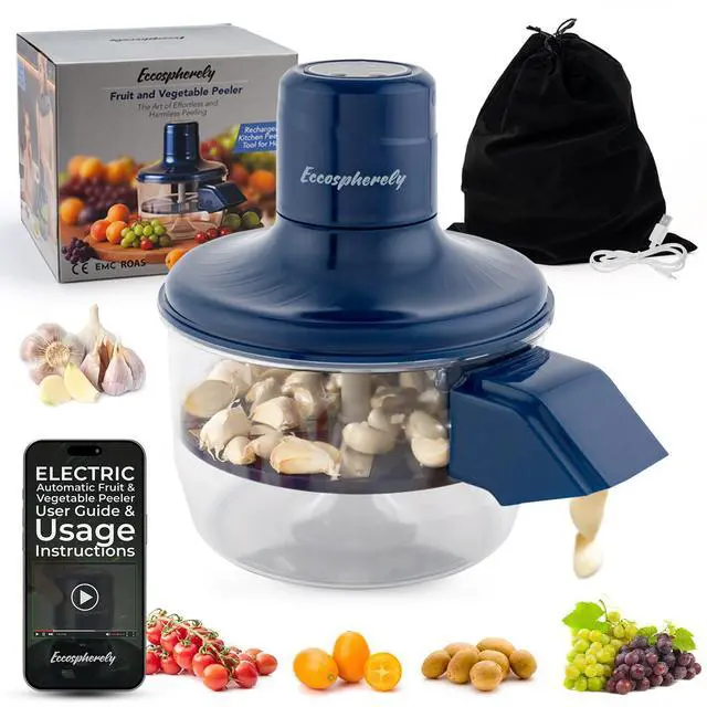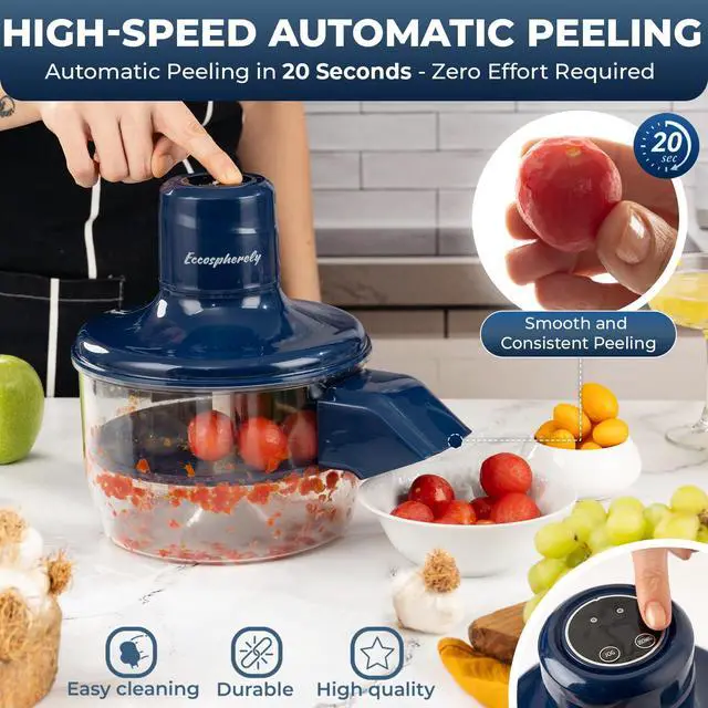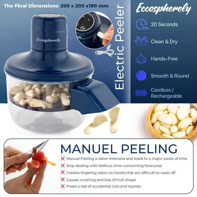 20 SECONDS HAND-FREE PEELINGPeel garlic, grapes, and cherry tomatoes up to 70% faster than manual peeling. This automatic electric peeler removes skins evenly in about 20 seconds, no squeezing, no sticky fingers, no wasted time & no mess.