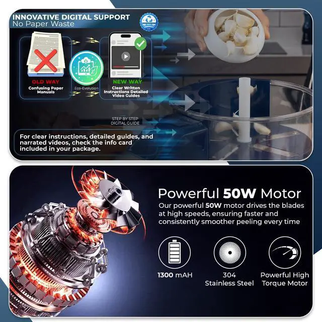 CORDLESS FREEDOM WITH 1300mAh POWERBuilt-in rechargeable battery supports multiple cycles per charge. Use this automatic peeler electric anywhere on the kitchen counter, dining table, or outdoor prep. No cords. No clutter. Just convenience.