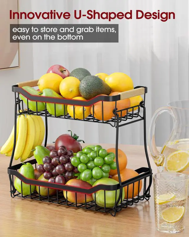 REMOVABLE BANANA HANGER: This 2-tier fruit basket for kitchen offers ample space to store a wide variety of fruits. The attached large banana hanger keeps bananas hanging freely. It prevents bananas from bruising and allows for proper air circulation, which extends their freshness.