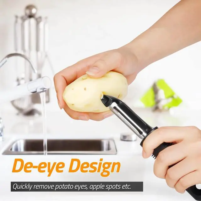Built-in potato eyerIncludes a built-in blemish remover. It has a super-sharp eye remover at the top of the blade that can easily scoop out blemishes and potato eyes.